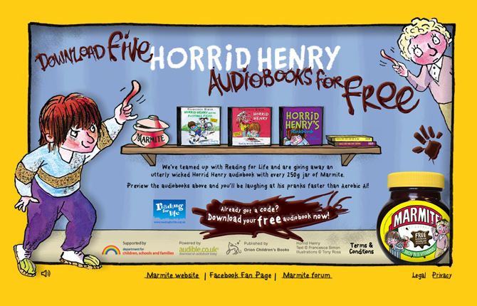 Web design and Flash animation promoting free Horrid Henry audiobooks with Marmite. Great project this one, I got to doodle with actual squeezy Marmite and do loads of animation.